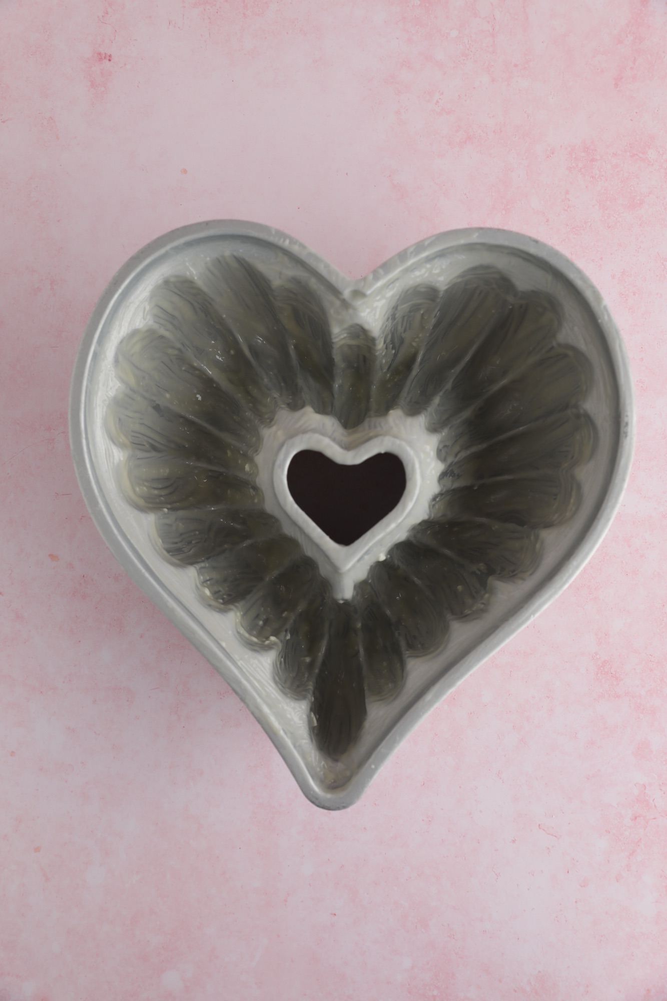 - Carefully brush the mixture along the inside of a 10 cup Heart Bundt Pan, making sure to get into all the grooves, but not letting excess sit in one spot. Chill in the fridge until you're ready to bake.