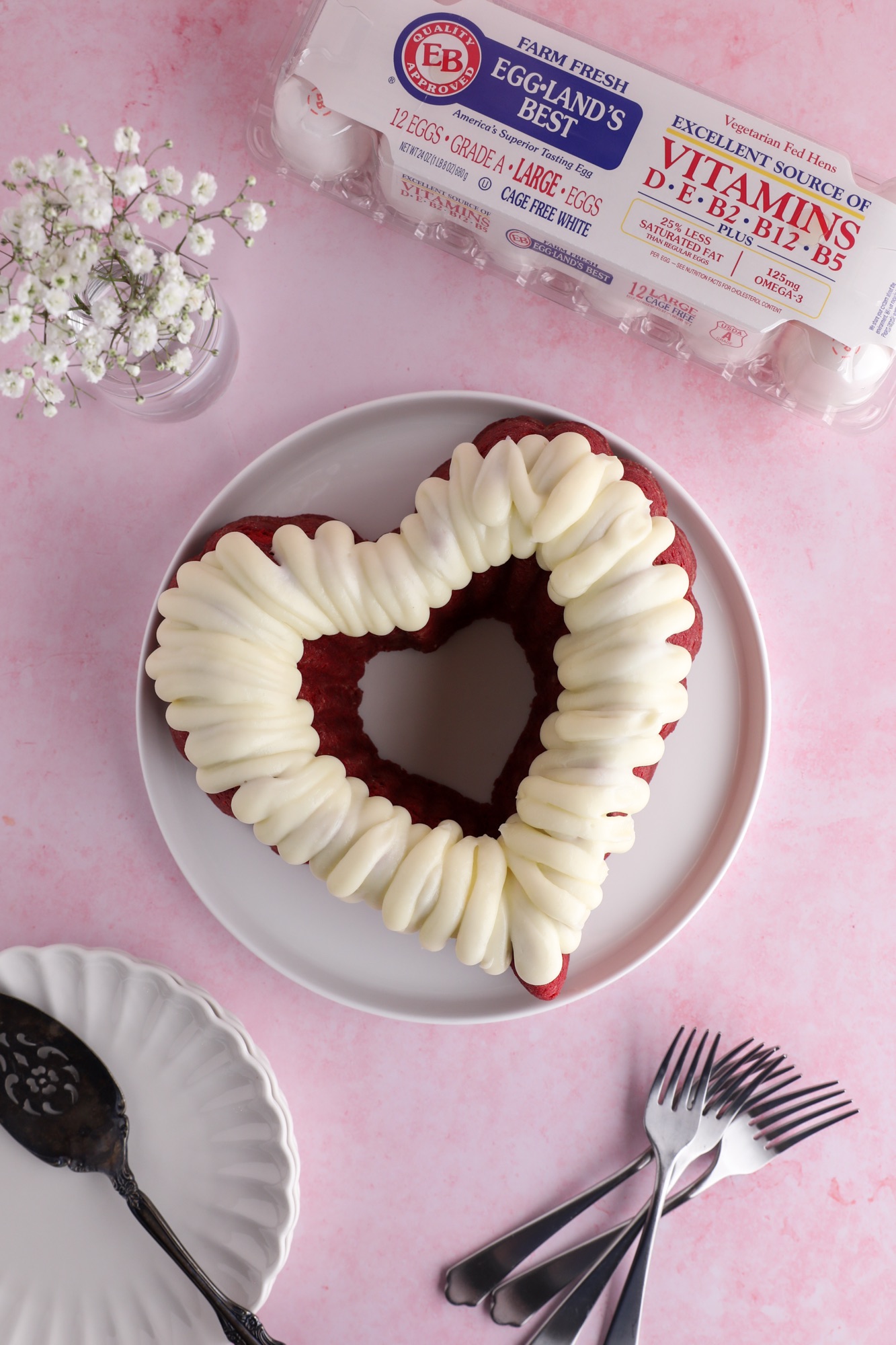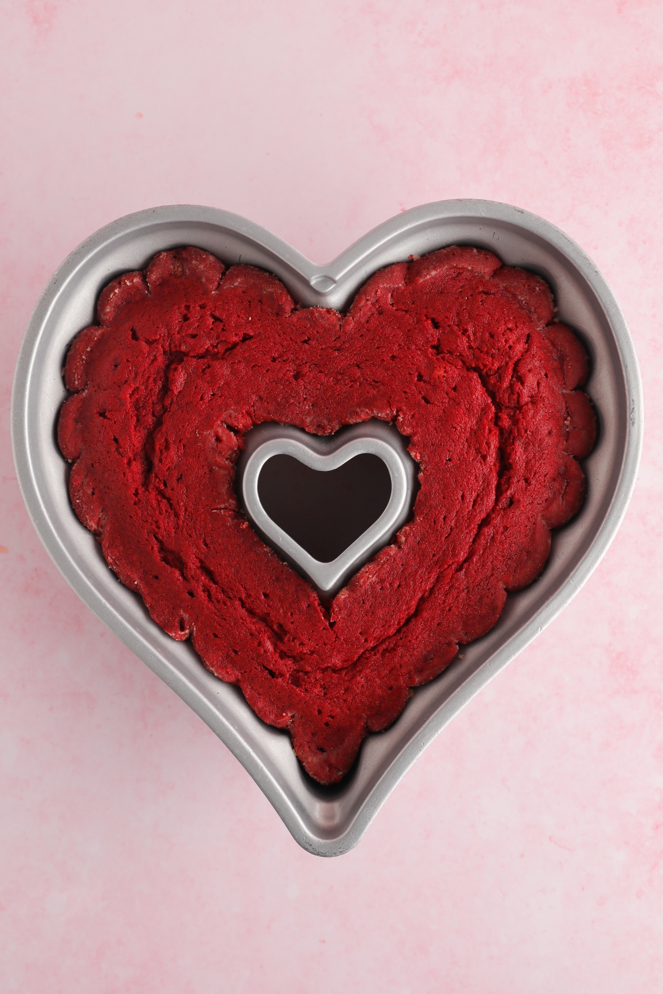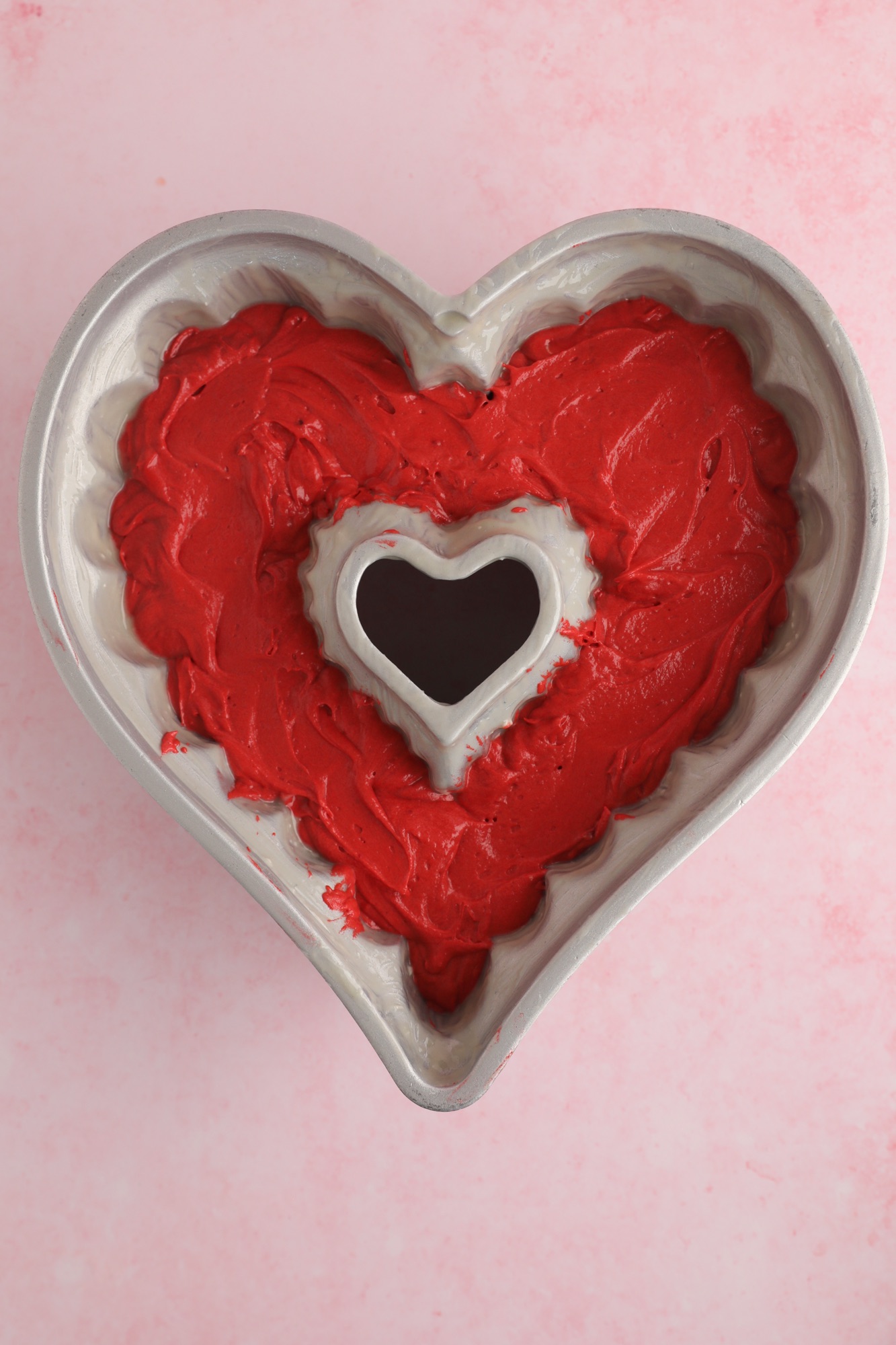 I recommend getting a 10 cup Heart Pan for this recipe. The cake batter comes together quickly and has that bright red look.